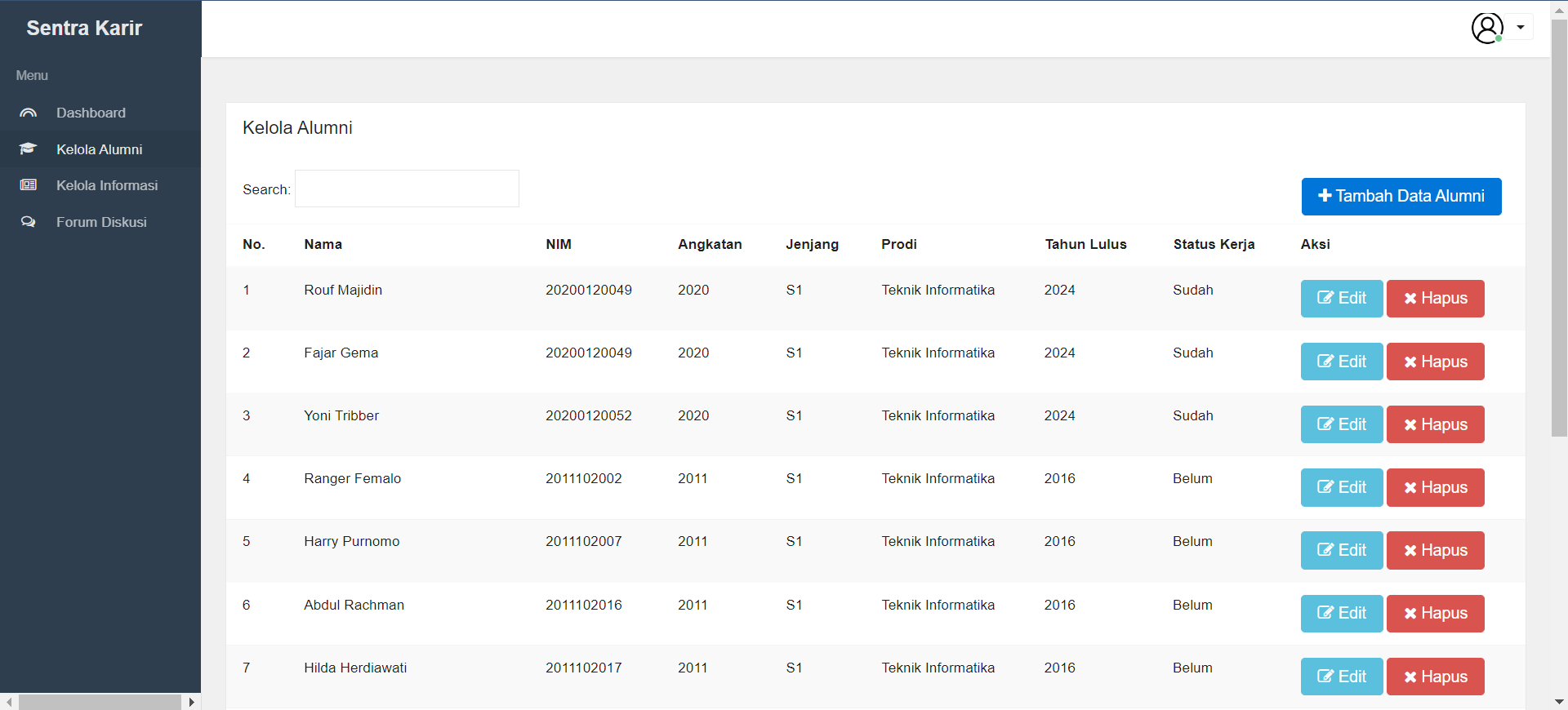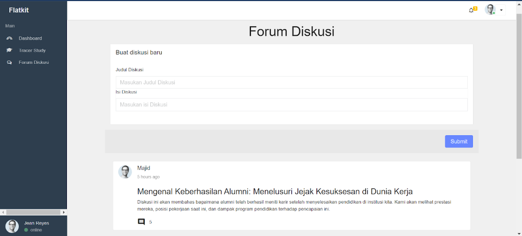 - User (Alumni): Can view information, fill out tracer study questionnaires, and participate in discussion forums.